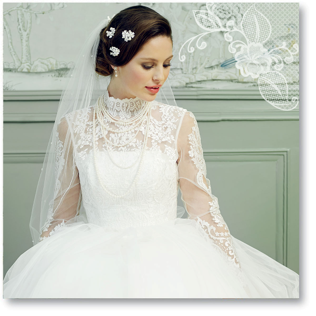Perler er brudens smykke - brug dem i lag-på-lag eller helt enkelt og klassisk. Her vist hvordan en flerradet perlekæde over en rigt broderet blondetop forvandler den enkle satinkjole til en sofistikeret brudekjole med et stærk udtryk. Se flere smykker >>