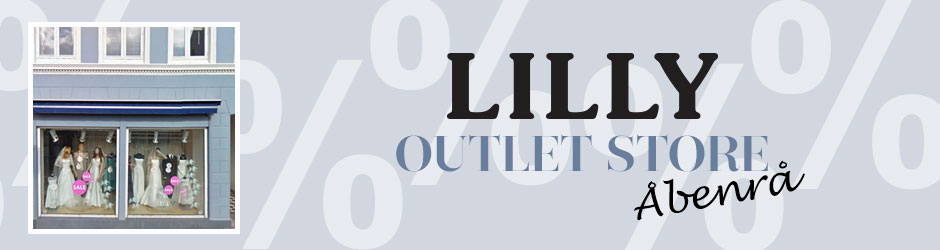 NYHED! LILLY Outlet Store i Åbenrå: Fra d. 1. Maj er LILLY butikken i Åbenrå blevet forvandlet til et Outlet med brudekjoler til 2.500,- (uanset førpris!) Vi har fyldt butikken med udgående brudekjoler, 2. sorterings kjoler og flotte kollektionsprøver fra vores kreative design-stuer. Læs mere her >>
