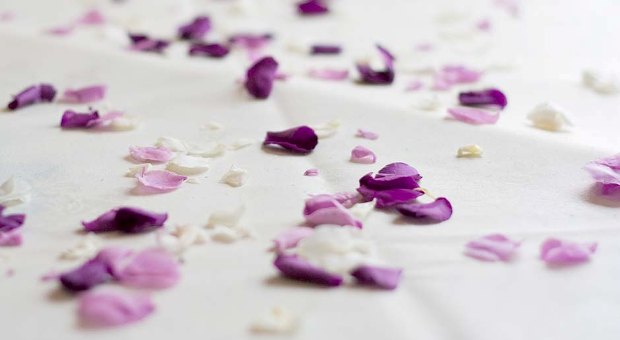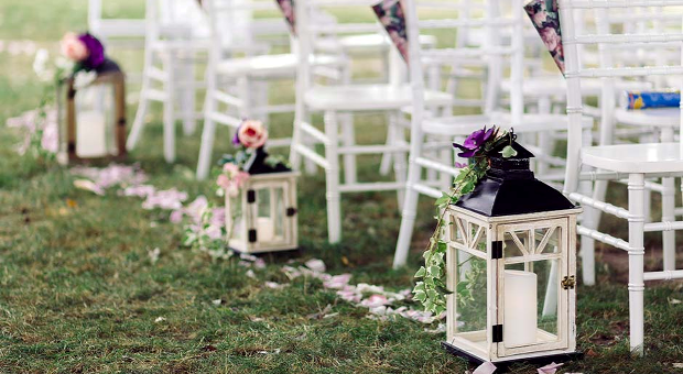 Her er blomster bundet fast på lanternerne og samtidig er der drysset rosenblade ud som en smuk markering af området, hvor brylluppet skal holdes.
