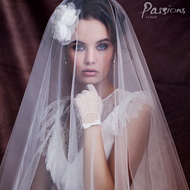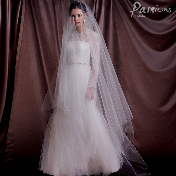Et langt slør uden på kjolen giver en dramatisk og meget romantisk effekt, samtidig med at det rent visuelt indhyller bruden.